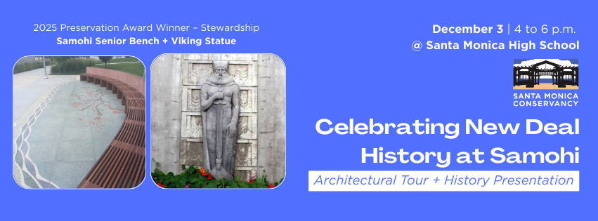 Santa Monica High School (Samohi) invites you to a public open house and reception to celebrate the restoration of art and architecture created during the New Deal in the 1930s. Barnum Hall, the school auditorium, showcases Moderne architecture and decorative artwork in one of the City’s most splendid historic landmarks. The Viking Warrior statue was salvaged from a demolition, restored, and installed in a prominent new location. The Senior Bench, with its beautiful petrachrome murals, was also relocated and restored. Both projects received a 2025 Preservation Award for Stewardship from the Santa Monica Conservancy.